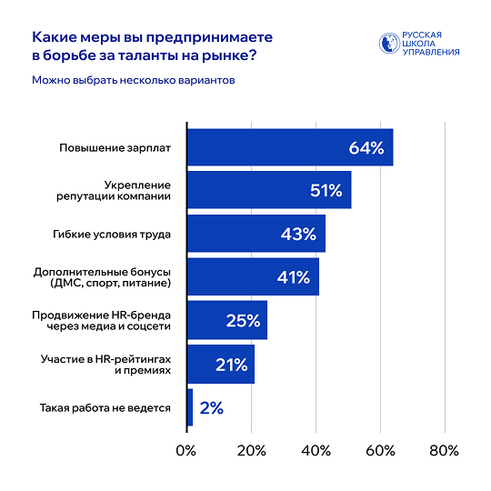 Все это заставляет бизнес пересматривать свои HR-стратегии. Согласно данным исследования, большинство компаний (64%) делают ставку на повышение зарплат как основной метод борьбы за таланты. Однако параллельно работодатели активно развивают и другие направления. Более половины опрошенных компаний (51%) целенаправленно работают над укреплением корпоративной репутации, понимая ее возрастающее значение для привлечения специалистов.
