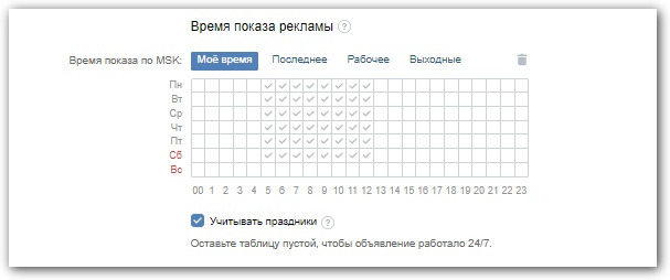 Расписание показов объявлений нужно выбирать, если ваша реклама связана со временем суток. Например, предлагать бодрящий утренний кофе вечером не стоит. Поэтому в этом пункте логично отметить часы до полудня: